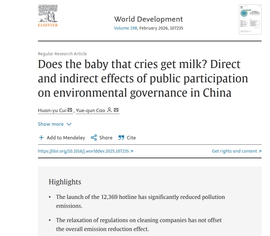 23级博士研究生崔寰宇与兼职教授曹跃群共同合作的论文《Does the baby that cries get milk? Direct and indirect effects of public participation on environmental governance in China》在经济学科高水平期刊World Development在线发表。World Development是发展研究(Development Studies)领域的国际顶级刊物,影响因子在发展研究和经济学期刊领域中长期名列前茅,属于中科院一区Top期刊和JCR一区。